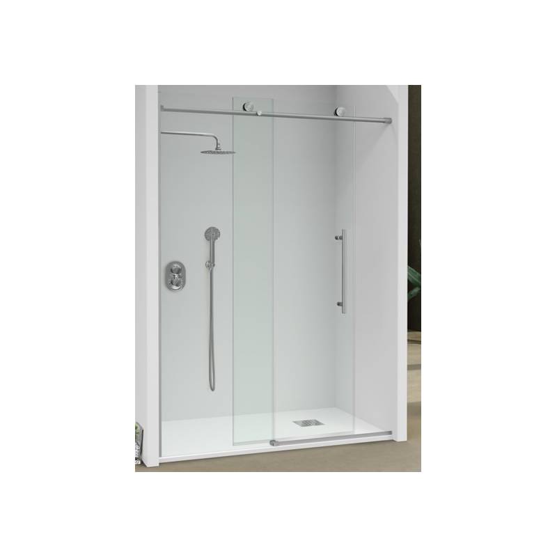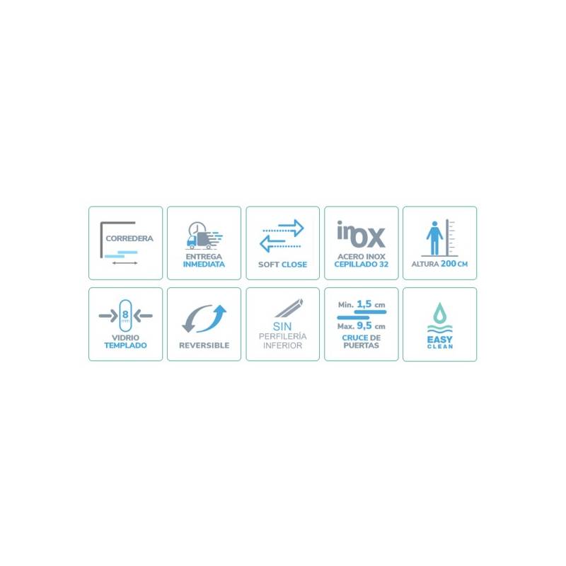 Está compuesta por un 1 hoja fija + 1 hoja corredera, vidrio templado de seguridad de 8 mm.