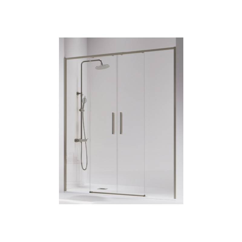 Está compuesta por un frontal de 2 cristales fijos laterales y 2 hojas correderas centrales de 6 mm en vidrio templado de seguridad.